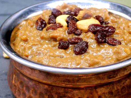 4.Simmer & Finish : Allow it to cook till thick. Mix cardamom powder and ghee-roasted cashews and raisins in a small tadka pan.