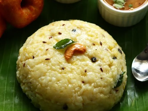 3.Finish with Ghee & Nuts : Dry roast nuts and raisins in a small nonstick tadka pan and add to the pongal. Combine with a flat spoon or spatula